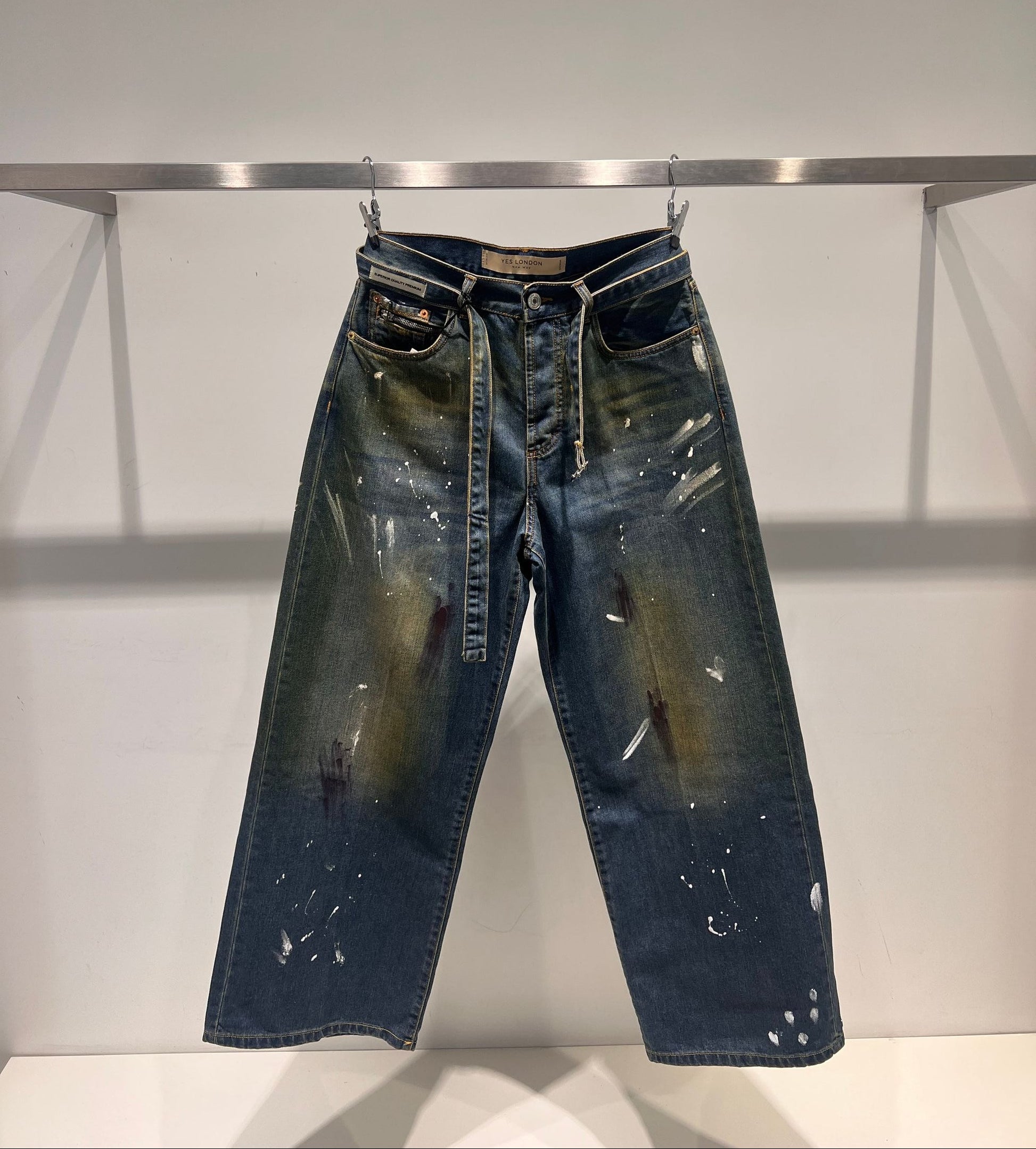 Denim a gamba larga con cinturino e ciappe per regolare il fondo
